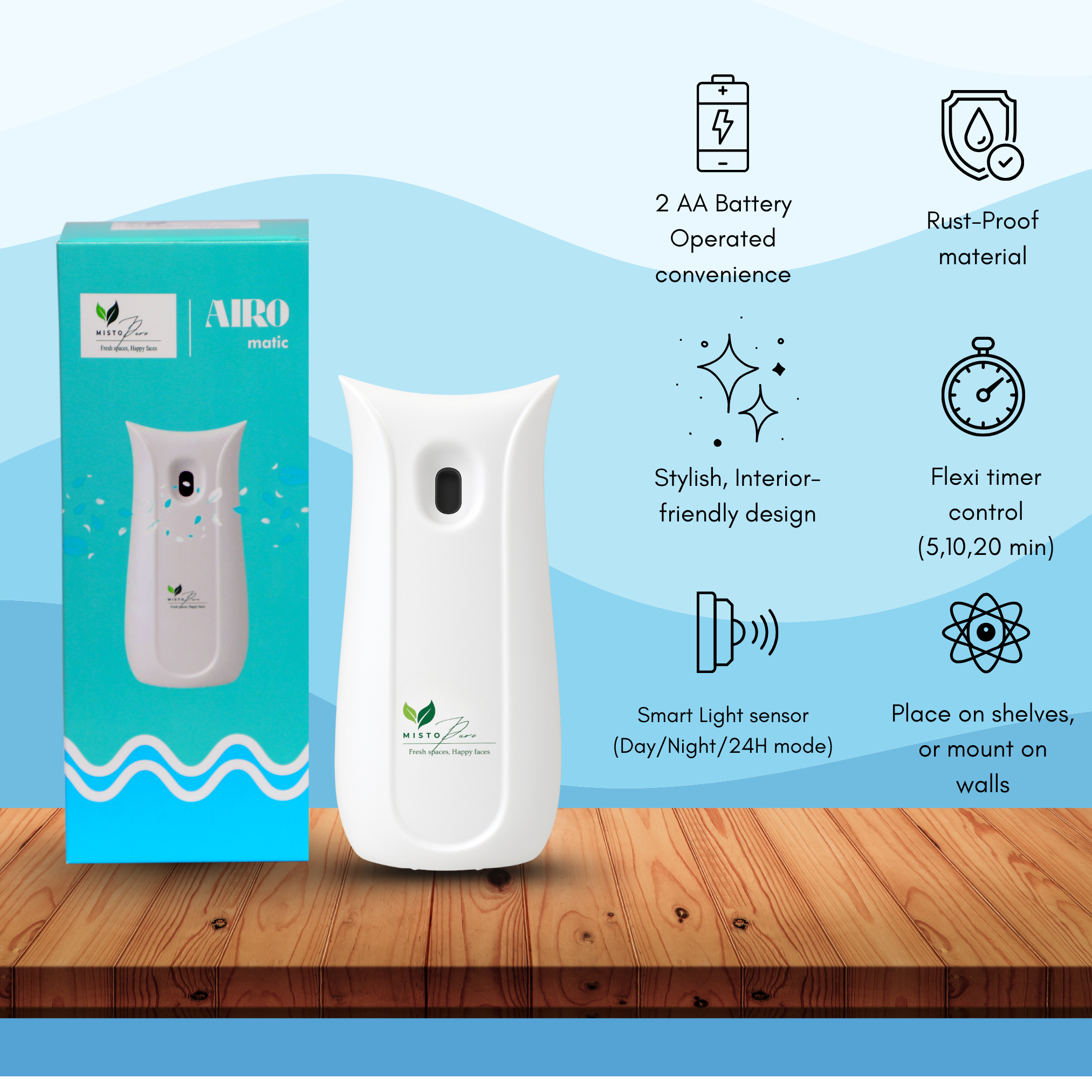 With its energy-efficient, battery-operated design and easy wall-mount setup, MISTOPURE Airo brings effortless freshness — stylishly and sustainably.